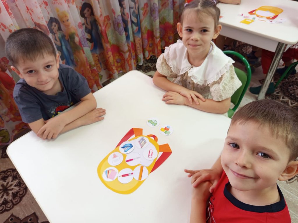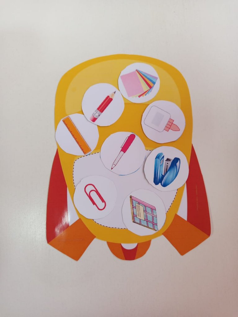 Балаларға суреттерге қарап, жұмбақтарды шешіп, мектеп құралдарының атауларын атауды ұсыныңыз. Ойыншылар жұмбақтарды шешіп, сөмкеге заттарды салады.